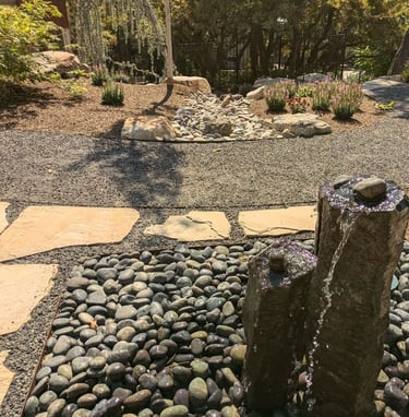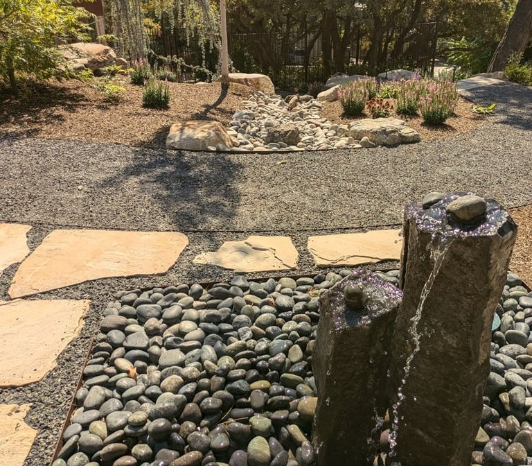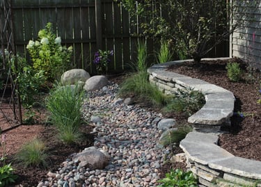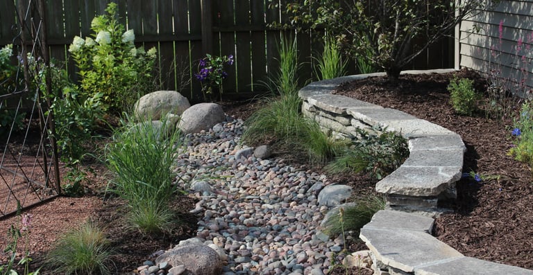 Using stone in creative and aesthetic ways from boulders and cobbles in the design, along with dry creeks can resolve drainage areas and conserve water while adding attractive aesthetics overall.